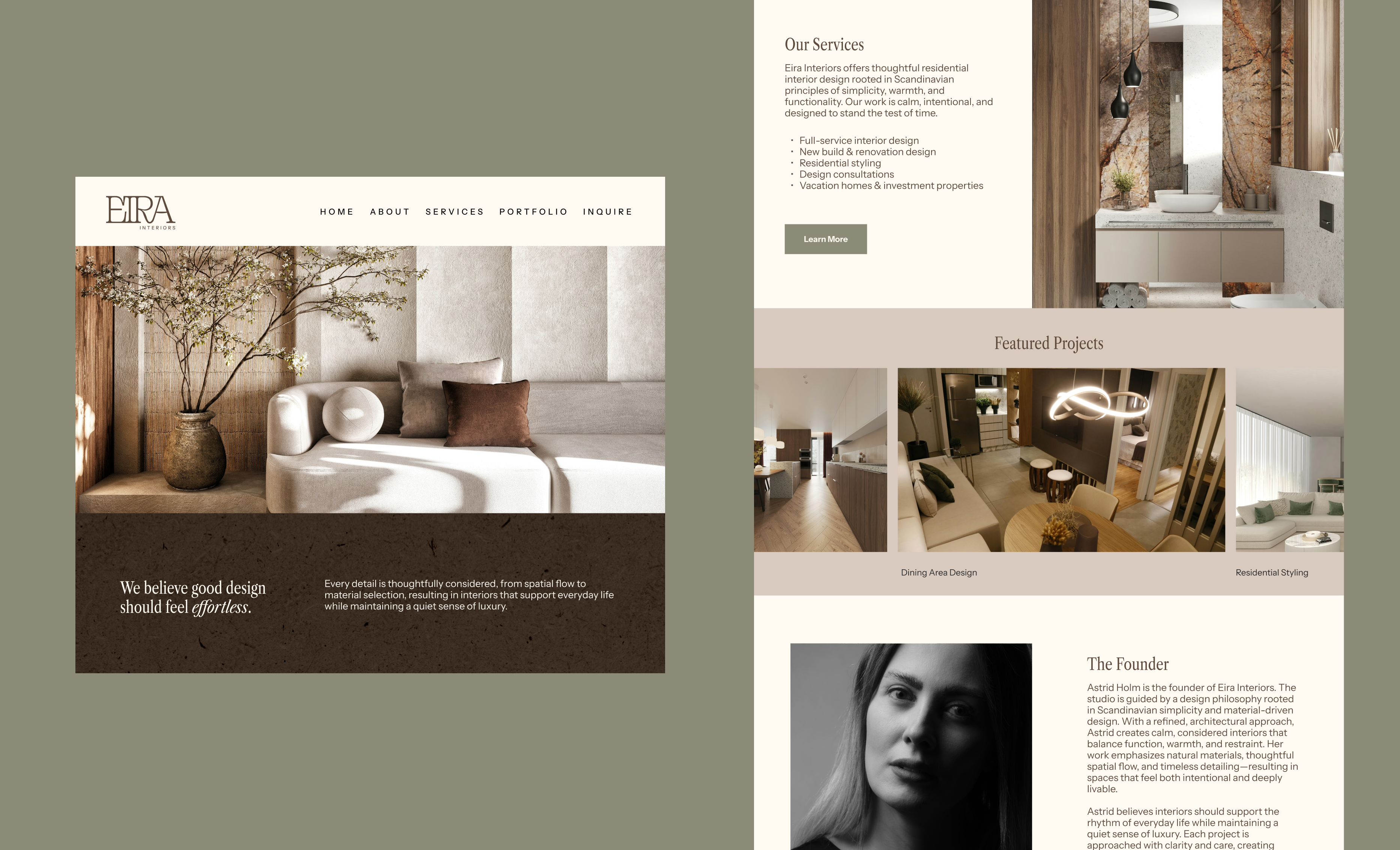 Eira Interiors is a interior design studio rooted in Scandinavian principles of simplicity, warmth, and functionality. The project focused on creating a calm, refined brand presence that reflects the studio's approach to thoughtful, timeless residential design.